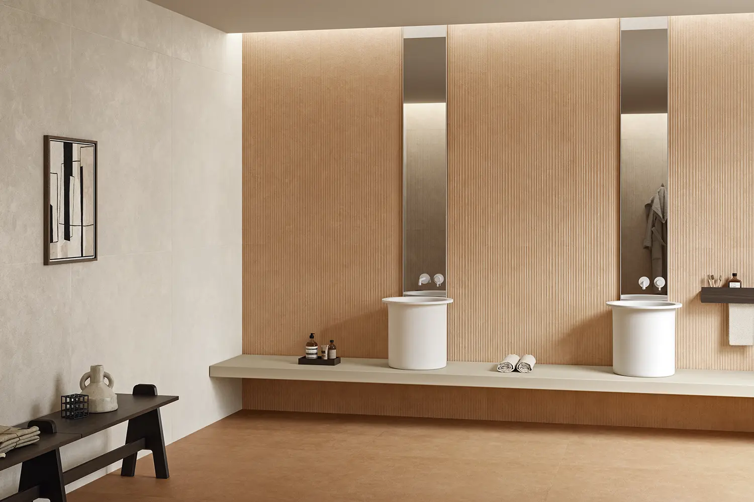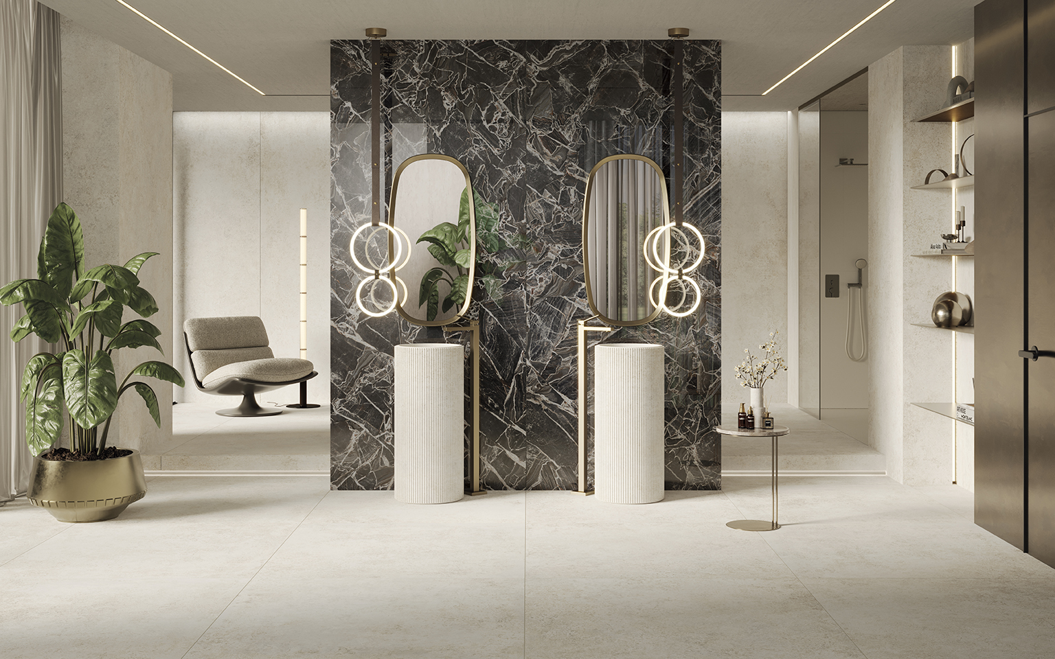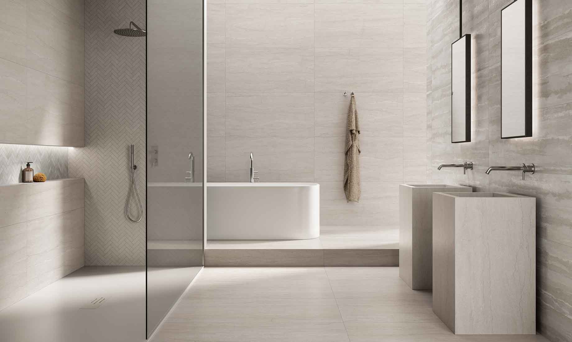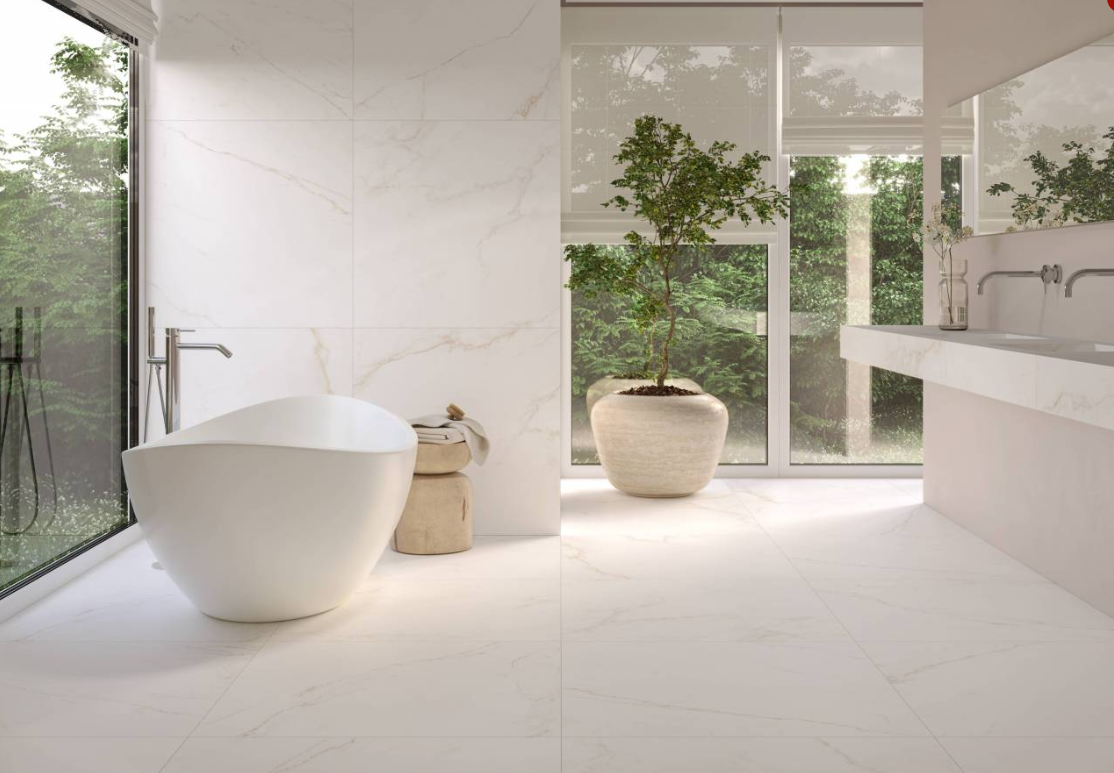 Stone-effect tiles introduce natural texture and warmth, creating a grounded and serene atmosphere, while marble-effect tiles bring luxurious veining and luminous contrast for a sophisticated touch.
