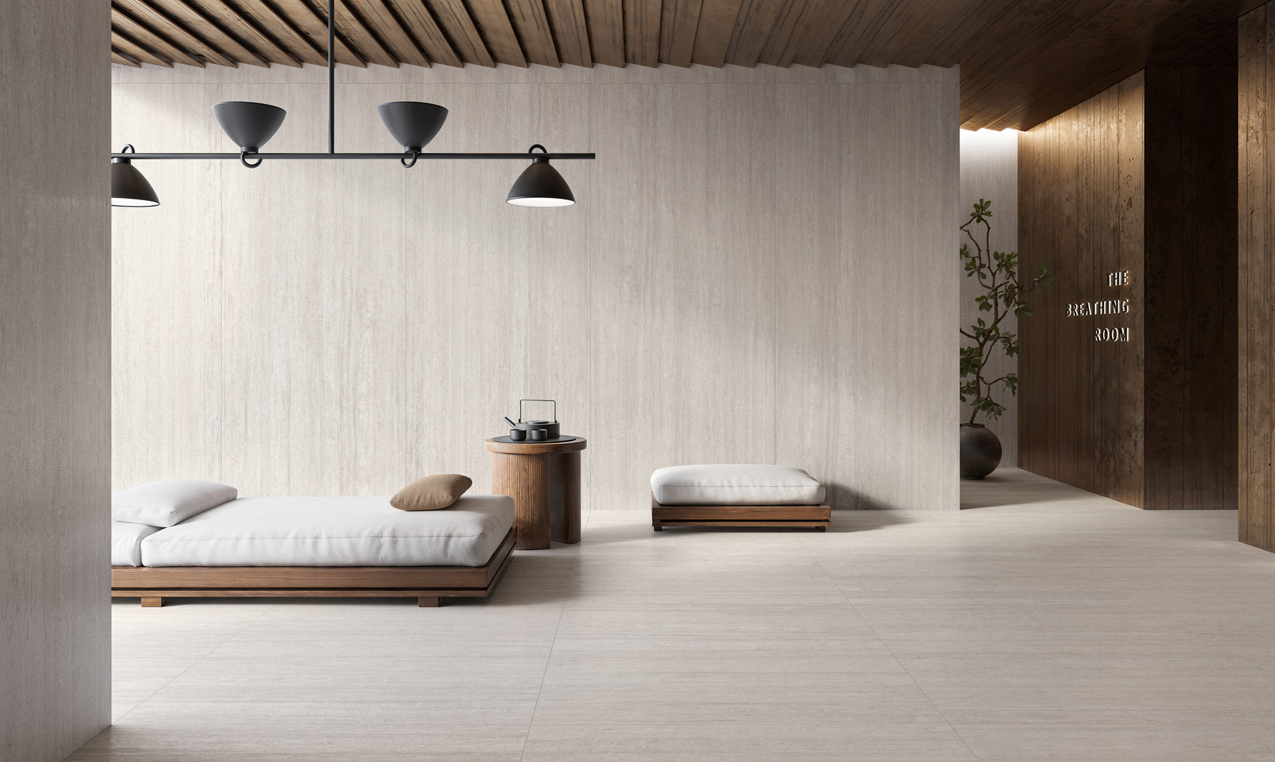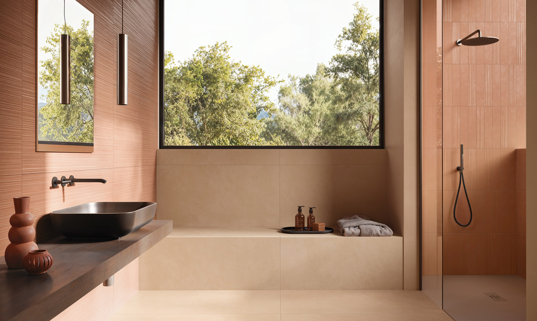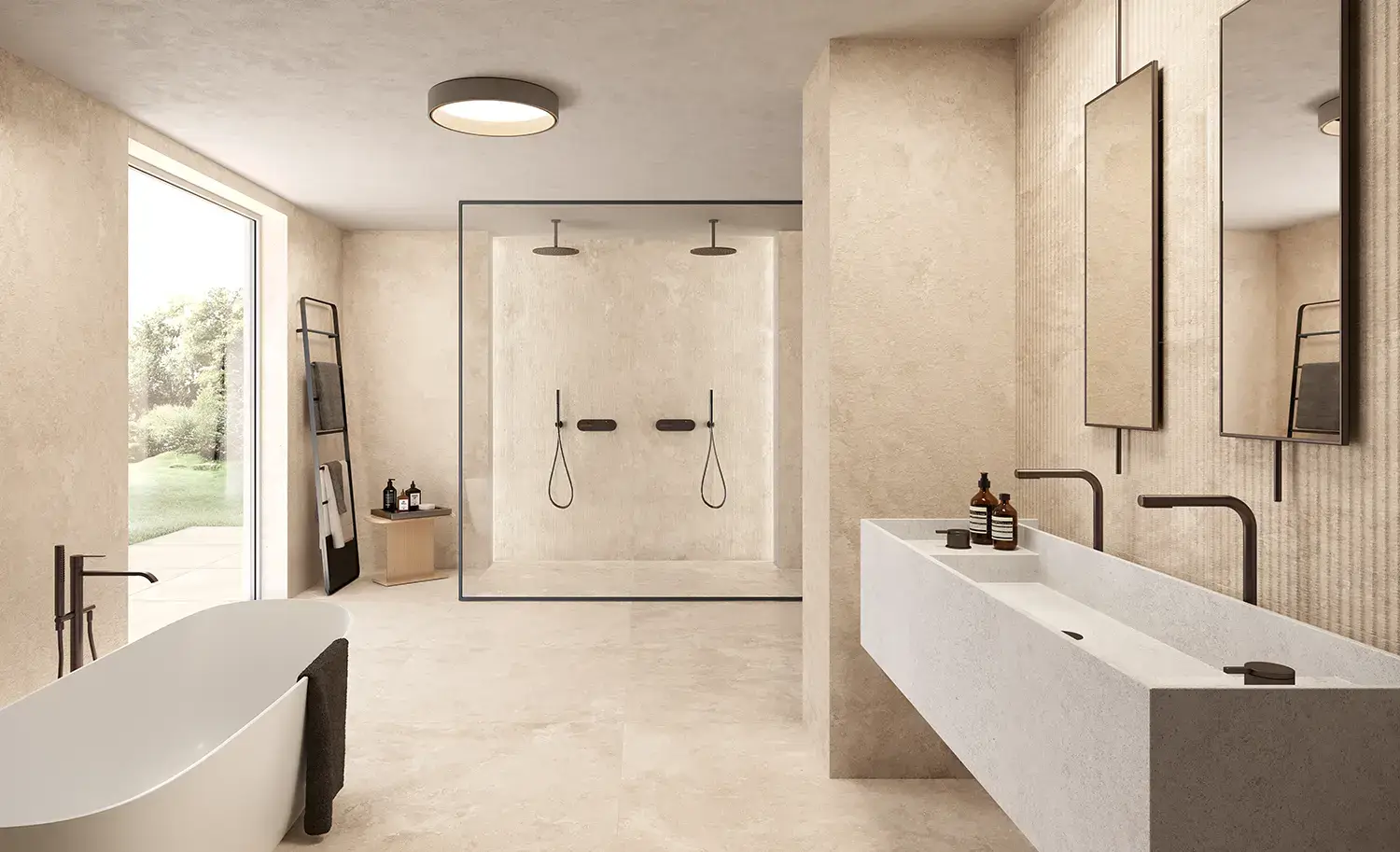 Stone-effect tiles introduce natural texture and warmth, creating a grounded and serene atmosphere, while marble-effect tiles bring luxurious veining and luminous contrast for a sophisticated touch.